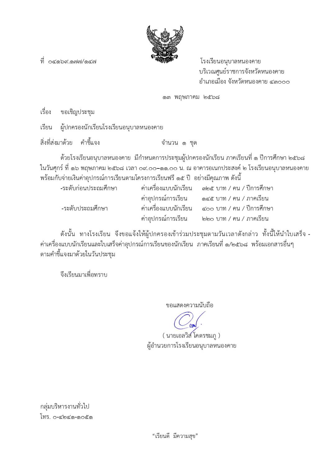 ขอเชิญประชุมผู้ปกครองนักเรียนโรงเรียนอนุบาลหนองคาย ภาคเรียนที่ 1 ปีการศึกษา 2568